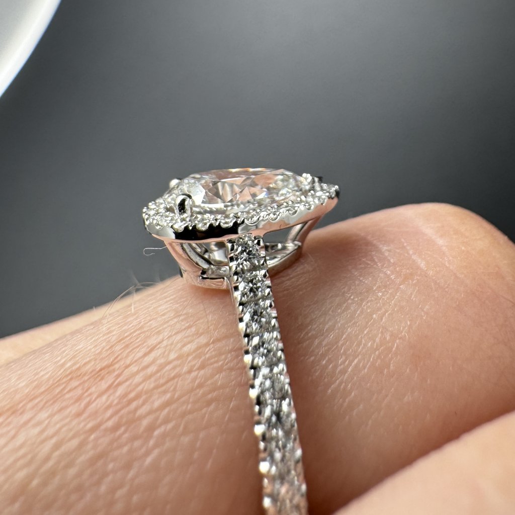 Elegantní prsten s centrálním laboratorním diamantem ve tvaru kapky, orámovaný třpytivým halo drobných kamenů. Ideální volba pro výjimečný okamžik.