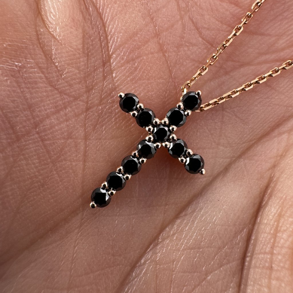 Tento rafinovaný přívěsek ve tvaru kříže je vyroben z kvalitního 14karátového žlutého zlata a zdoben jedenácti přírodními černými diamanty. Černé diamanty jsou vzácné a specifické svou temnou, neprůhlednou barvou, kterou získávají díky vysokému obsahu grafitu a unikátní vnitřní struktuře. V přírodě se těží zejména v Brazílii a Středoafrické republice.