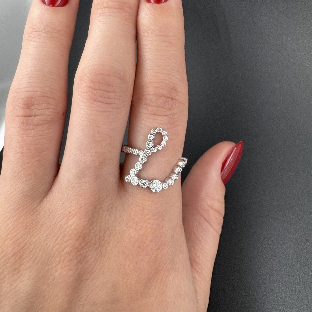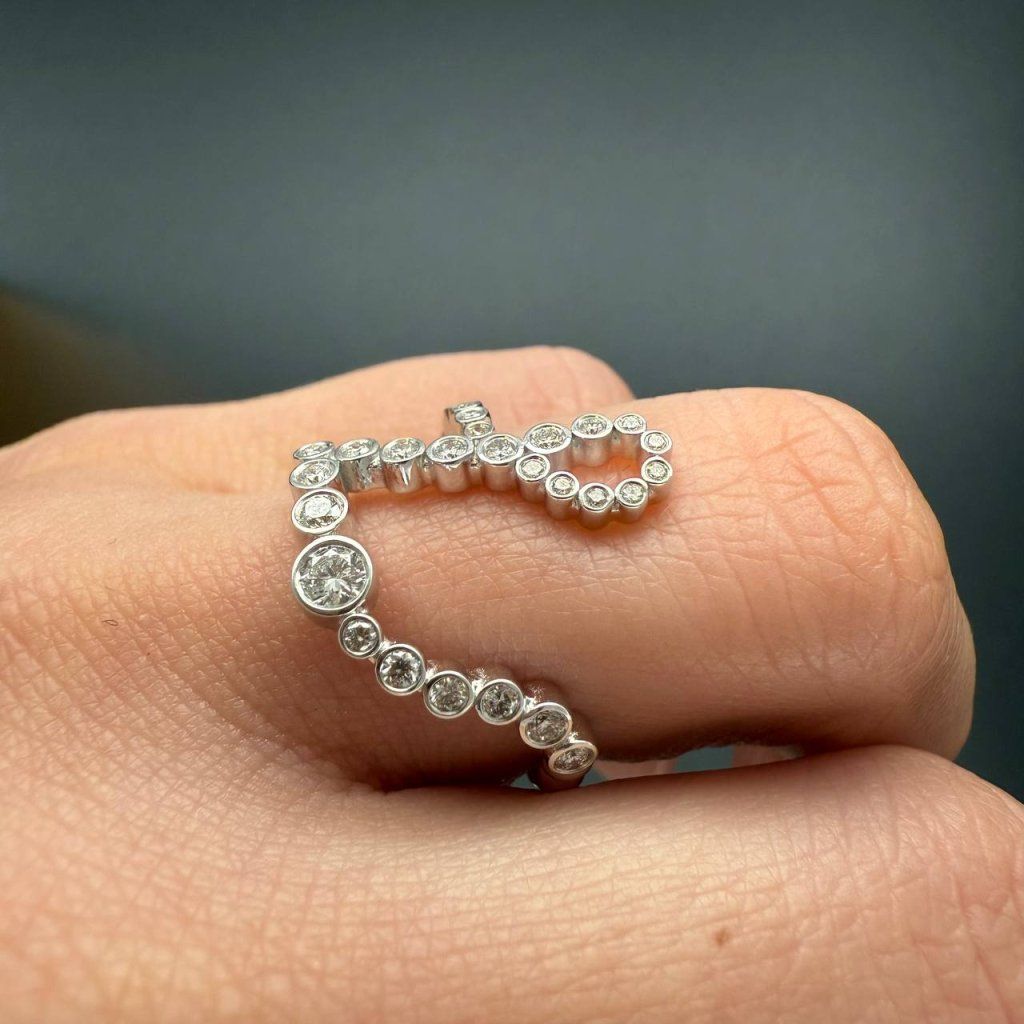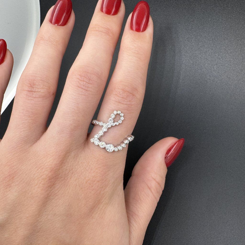 Tento výjimečný prsten z bílého zlata s přírodními diamanty představuje spojení moderního designu, osobního významu a precizního zlatnického zpracování. Jeho charakteristický tvar písmene L vytváří originální siluetu, která se jemně obtáčí kolem prstu a působí současně elegantně i sebevědomě. Diamanty jsou osazeny přibližně do poloviny prstenu v pečlivě zpracované řadě, která dodává šperku jemný, ale nepřehlédnutelný třpyt z každého úhlu.