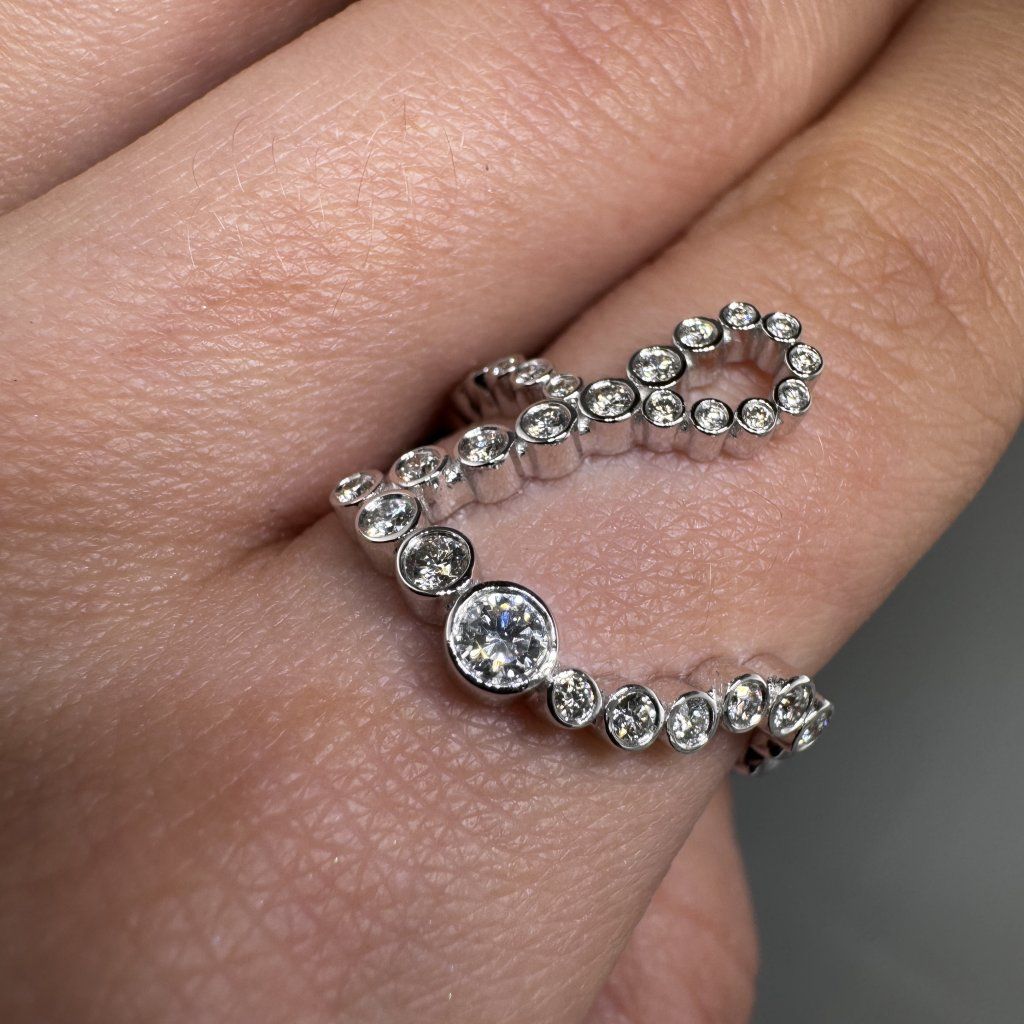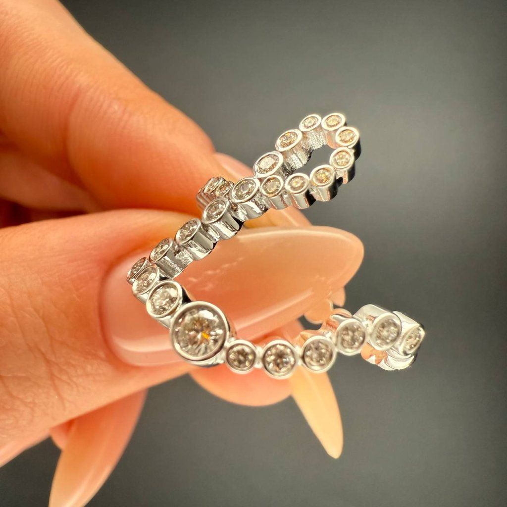 Elegantní prsten z bílého zlata s přírodními diamanty, osazenými přibližně na polovinu obvodu, zaujme svým moderním designem ve tvaru jemně otevřeného písmene. Diamanty různých velikostí jsou zasazeny v hladkých obrubách, které vytvářejí sofistikovaný rytmus a dodávají prstenu výrazný, ale stále elegantní vzhled. Tento šperk působí současně luxusně i lehce a je ideální volbou pro ženu, která hledá originální, nadčasový a sebevědomý doplněk pro každodenní nošení i výjimečné příležitosti.V rámci stejného modelu lze diamanty nahradit jinými kameny dle přání klienta.