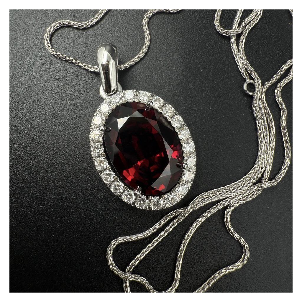 Přívěsek je vyroben z 14karátového bílého zlata, jehož chladný, ušlechtilý lesk dokonale zvýrazňuje hloubku centrálního kamene. V srdci kompozice se nachází přírodní červený granát z Mozambiku, známý svým sytým vínově červeným odstínem a výraznou vnitřní hrou světla. Kámen má působivou velikost 12,8 × 9,2 mm, díky čemuž se stává hlavním akcentem šperku.
