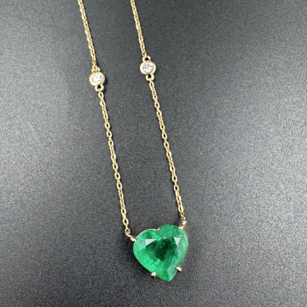Elegantní náhrdelník ze žlutého 14karátového zlata zdobí nádherný smaragd o hmotnosti 3,22 karátu. Centrální kámen o rozměrech 9,5 × 10,5 × 6 mm vyniká sytou barvou a přirozeným leskem, které dodávají šperku výjimečný a vytříbený charakter.