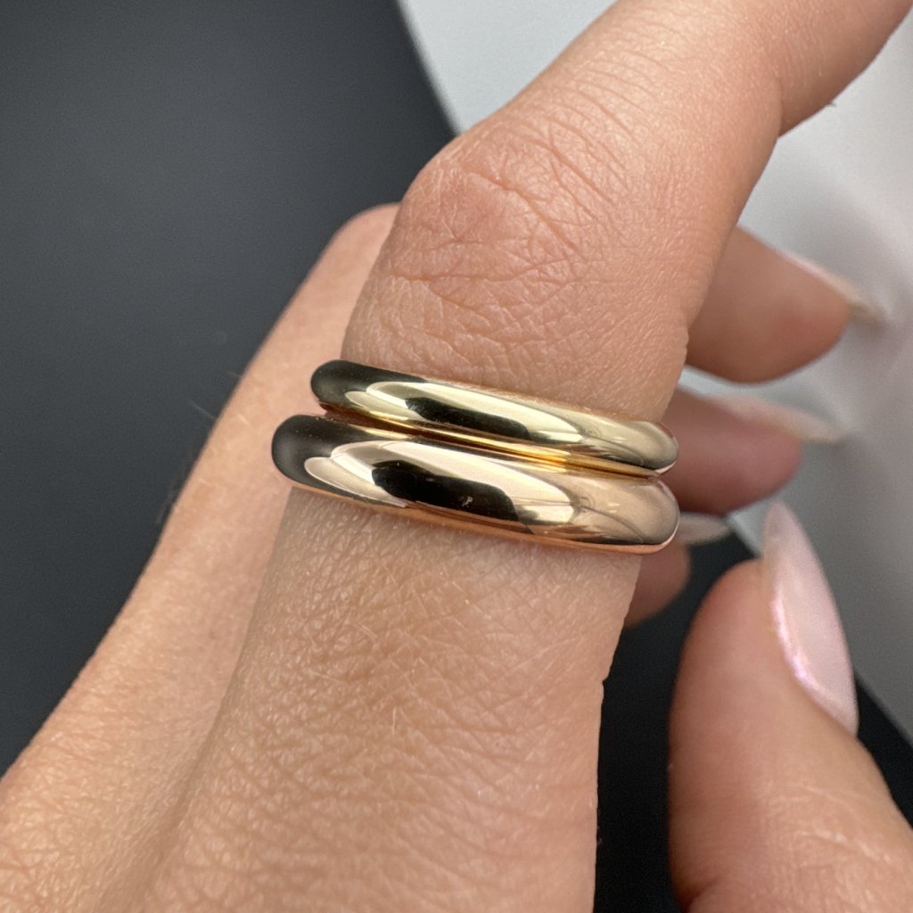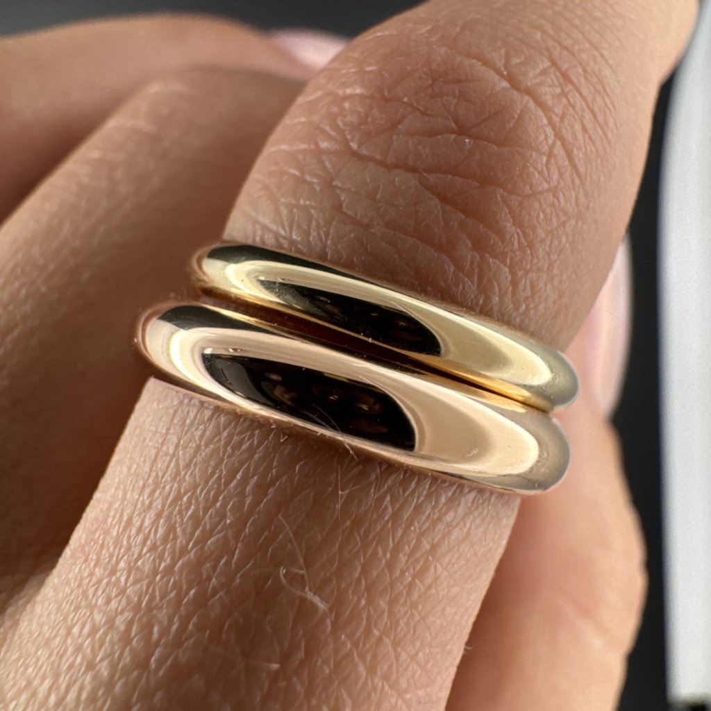Tato pár snubních prstenů představuje dokonalou rovnováhu mezi klasikou a moderním přístupem. Každý prsten je vyroben z jiného kovu – jeden z růžového zlata, druhý ze žlutého zlata, oba o ryzosti 14 karátů. Lesklá povrchová úprava dodává šperkům sofistikovaný vzhled a zvýrazňuje kvalitu zlatnického zpracování.