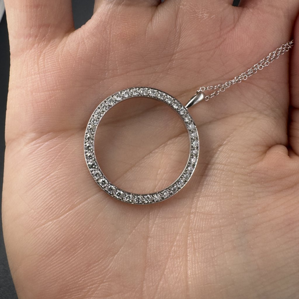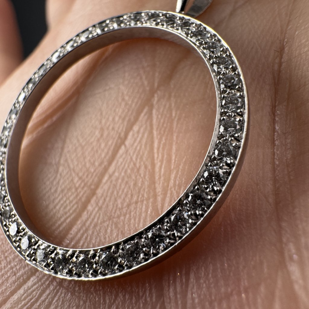 Elegantní přívěsek z bílého zlata ve tvaru kruhu je osazen 37 přírodními brilianty, které vytvářejí jemný, rovnoměrný třpyt po celém obvodu. Precizní zlatnické zpracování a čistý kruhový tvar dodávají šperku nadčasovou eleganci a symboliku nekonečna. Tento přívěsek je ideální volbou pro ženu, která hledá luxusní, ale zároveň decentní šperk s trvalou hodnotou, vhodný pro každodenní nošení i výjimečné okamžiky. V rámci stejného modelu lze diamanty nahradit jinými kameny dle přání klienta.