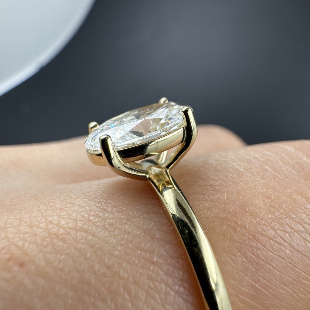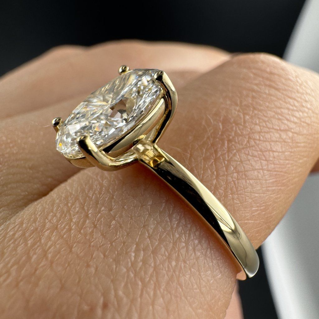 Tento prsten s laboratorně vypěstovaným diamantem o hmotnosti 2,5 karátu jako by byl stvořen pro takový příběh. Kámen čistoty VVS2 a brusu Excellent odhaluje světlo bezchybně – nejen že se třpytí, on doslova dýchá, přelévá se a reaguje na každý pohyb ruky. Žluté zlato jej jemně obepíná, zvýrazňuje jeho teplo a podtrhuje hloubku jeho záře.