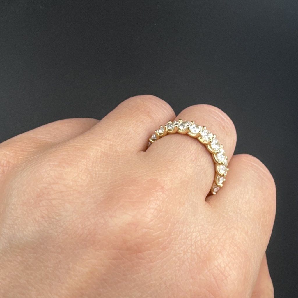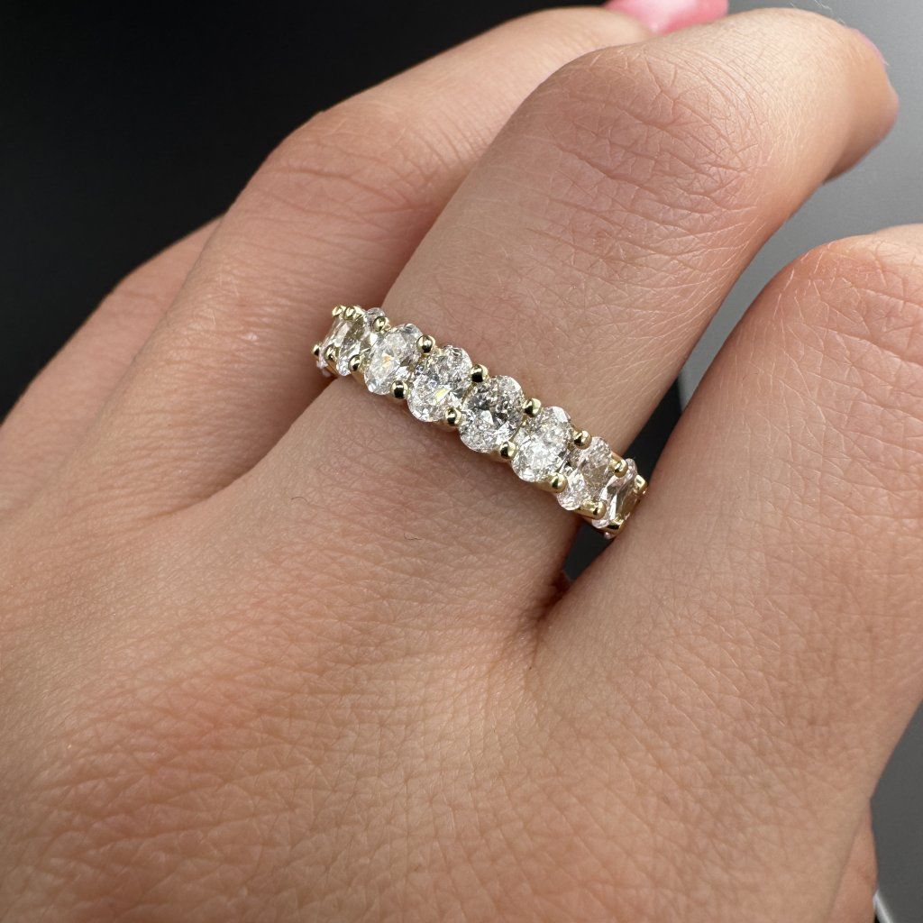 Tento prsten není jen šperk - je to symbol okamžiku, který mění život. Jemná linie z 11 oválných lab grown diamantů o velikosti 3×4 mm vytváří nepřerušený pás světla - jako slib daný ve svatební den. Kameny jsou pečlivě zasazeny do 14karátového zlata, jehož ušlechtilý teplý lesk podtrhuje jemné třpytění oválného brusu. Při každém pohybu ruky diamanty zachycují světlo a vytvářejí pocit živého, nekonečného lesku.