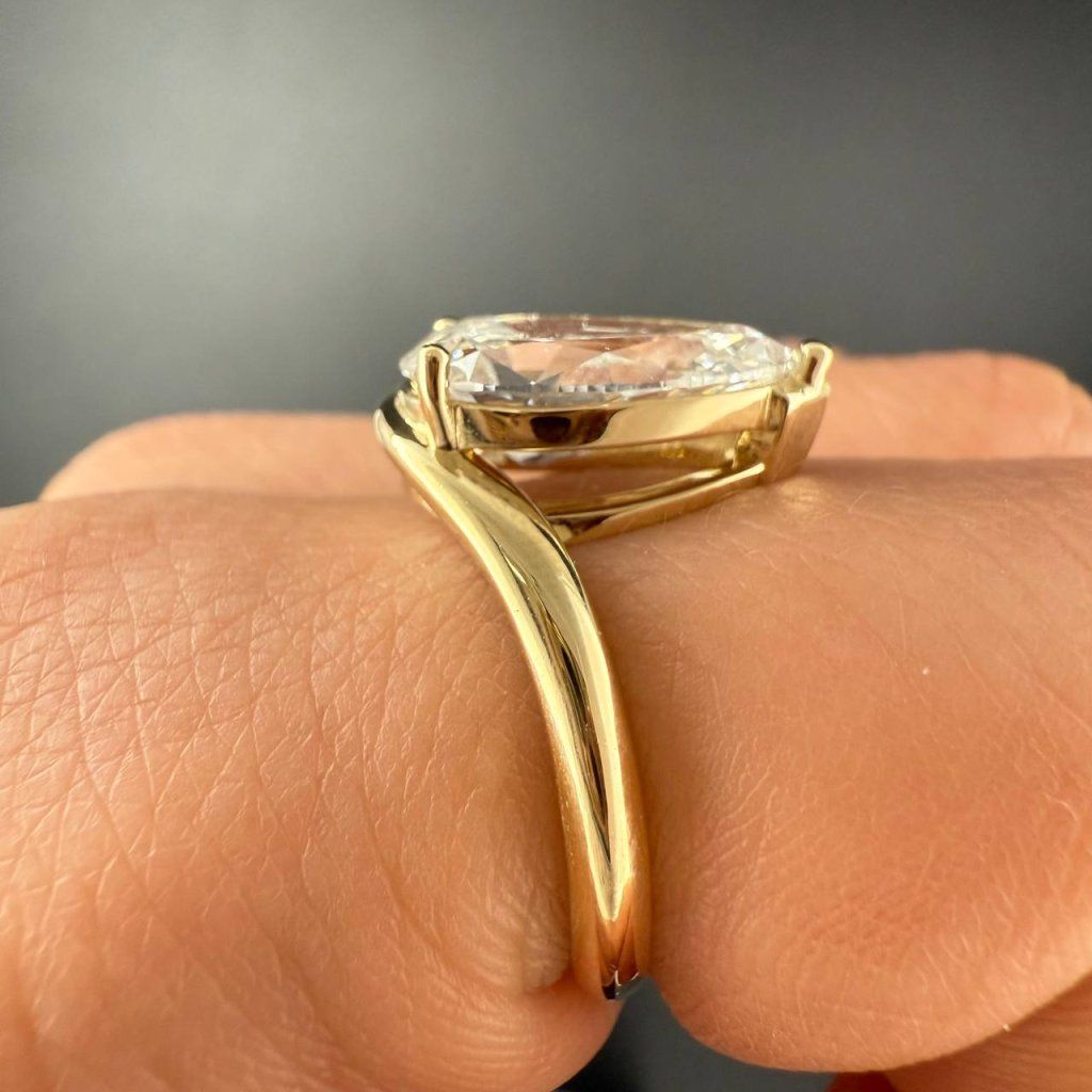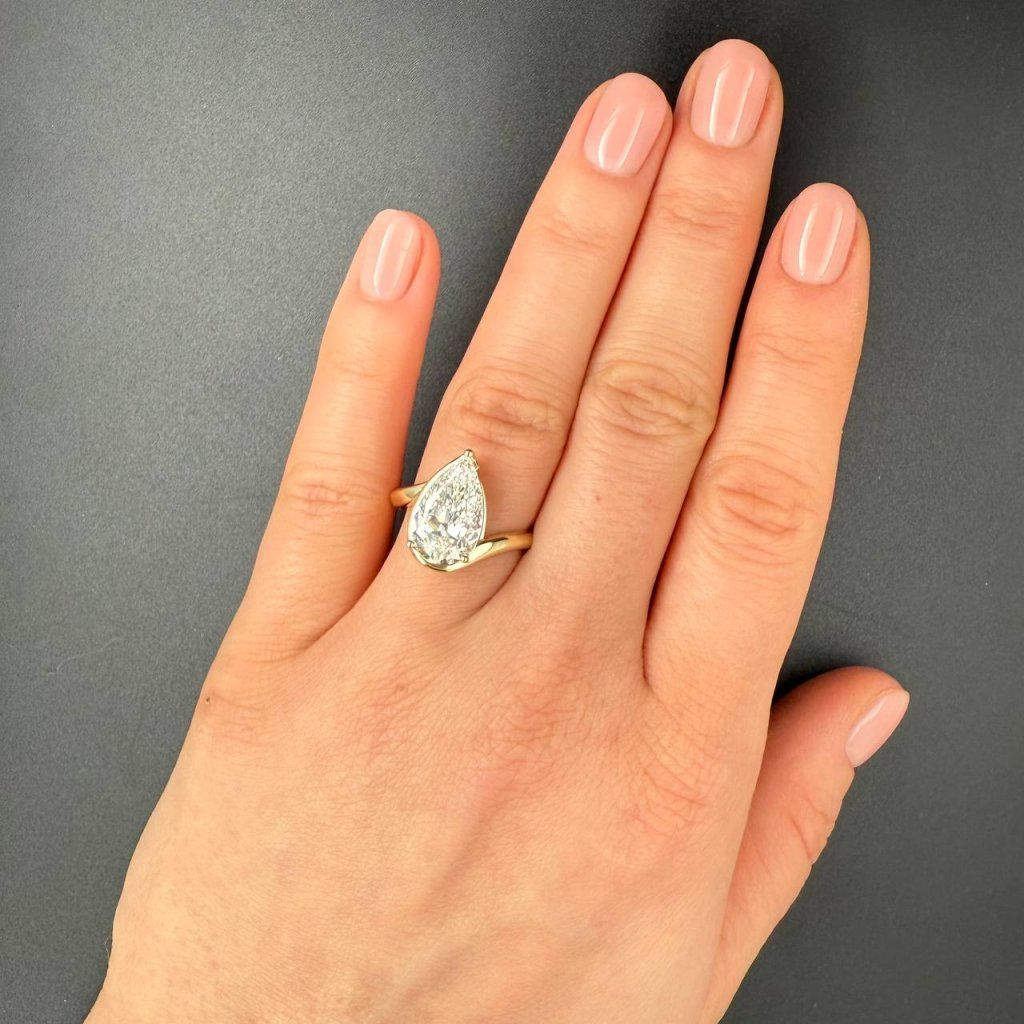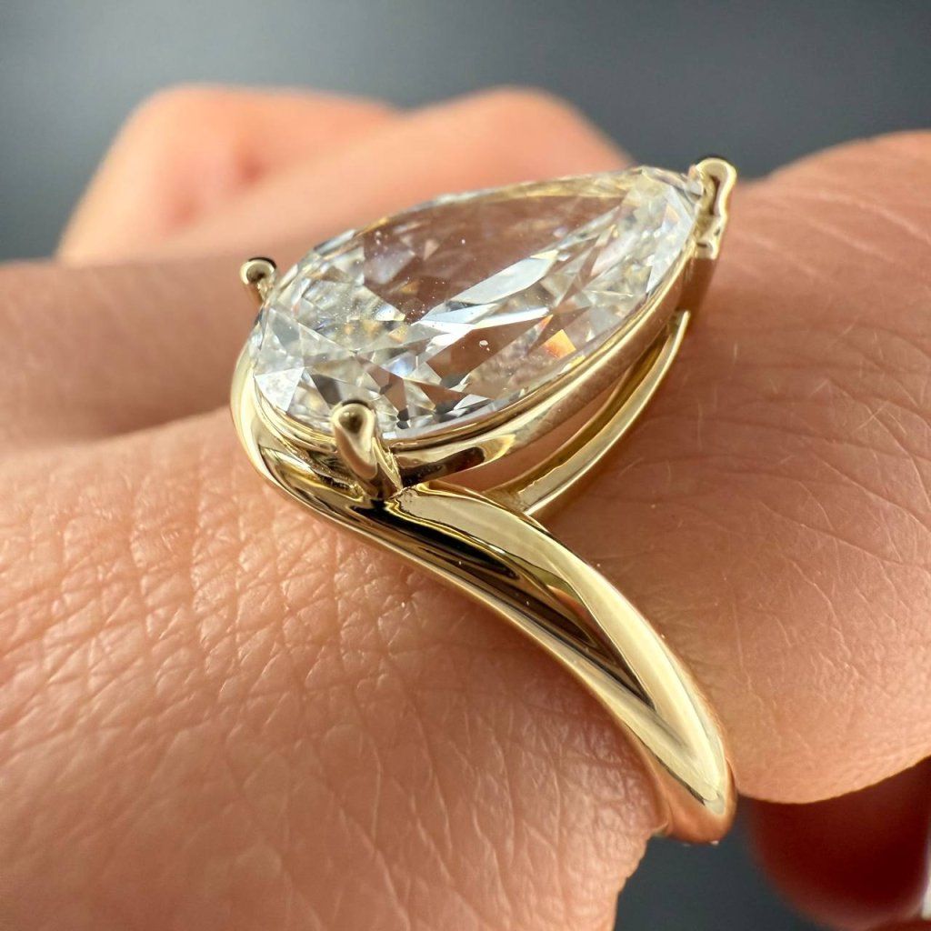 Elegantní prsten s výrazným laboratorně pěstovaným diamantem o hmotnosti 3,3 karátu, broušeným do vytříbeného tvaru kapky. Kámen harmonicky odhaluje hloubku a čistotu svého lesku a vytváří dojem zastavené kapky světla.