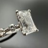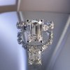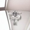 Tento prsten je definicí moderní elegance. V jeho srdci září laboratorně vytvořený diamant emerald brusu o velikosti 8,6 × 5,56 mm, váze 1,6 karátu, s výjimečnou čistotou VVS2 a precizním zpracováním – leštění i symetrie hodnocené jako excellent. Po stranách jsou vsazeny menší kulaté diamanty, které dodávají prstenu jemný rytmus a lehkost – jako by se na ruce usadil proud světla.