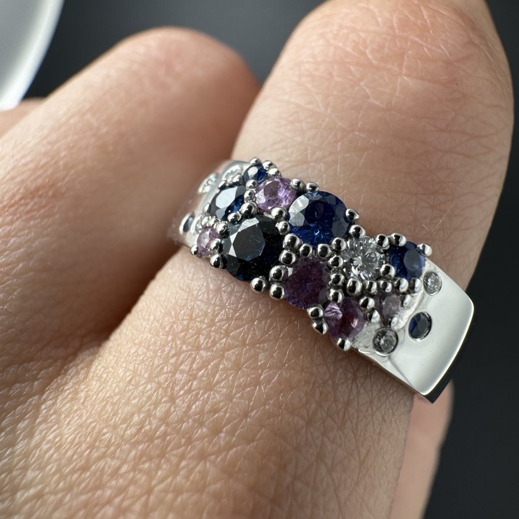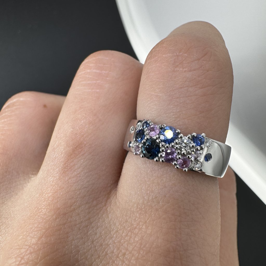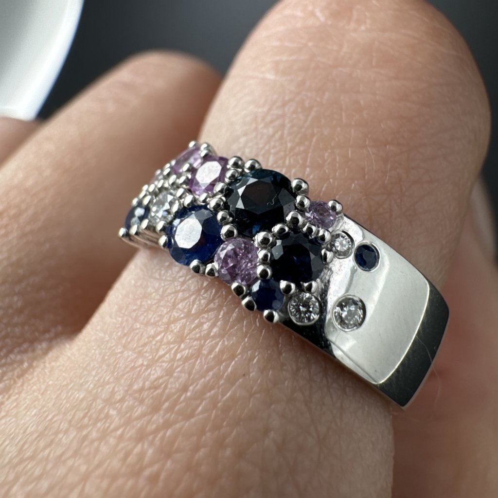 Prsten s růžovými a modrými safíry a diamanty je nejen elegantním doplňkem, ale také symbolem individuality, lásky a světla. Skvěle se hodí jak pro každodenní nošení, tak pro výjimečné příležitosti a vždy podtrhne vytříbený vkus své nositelky.