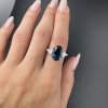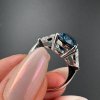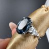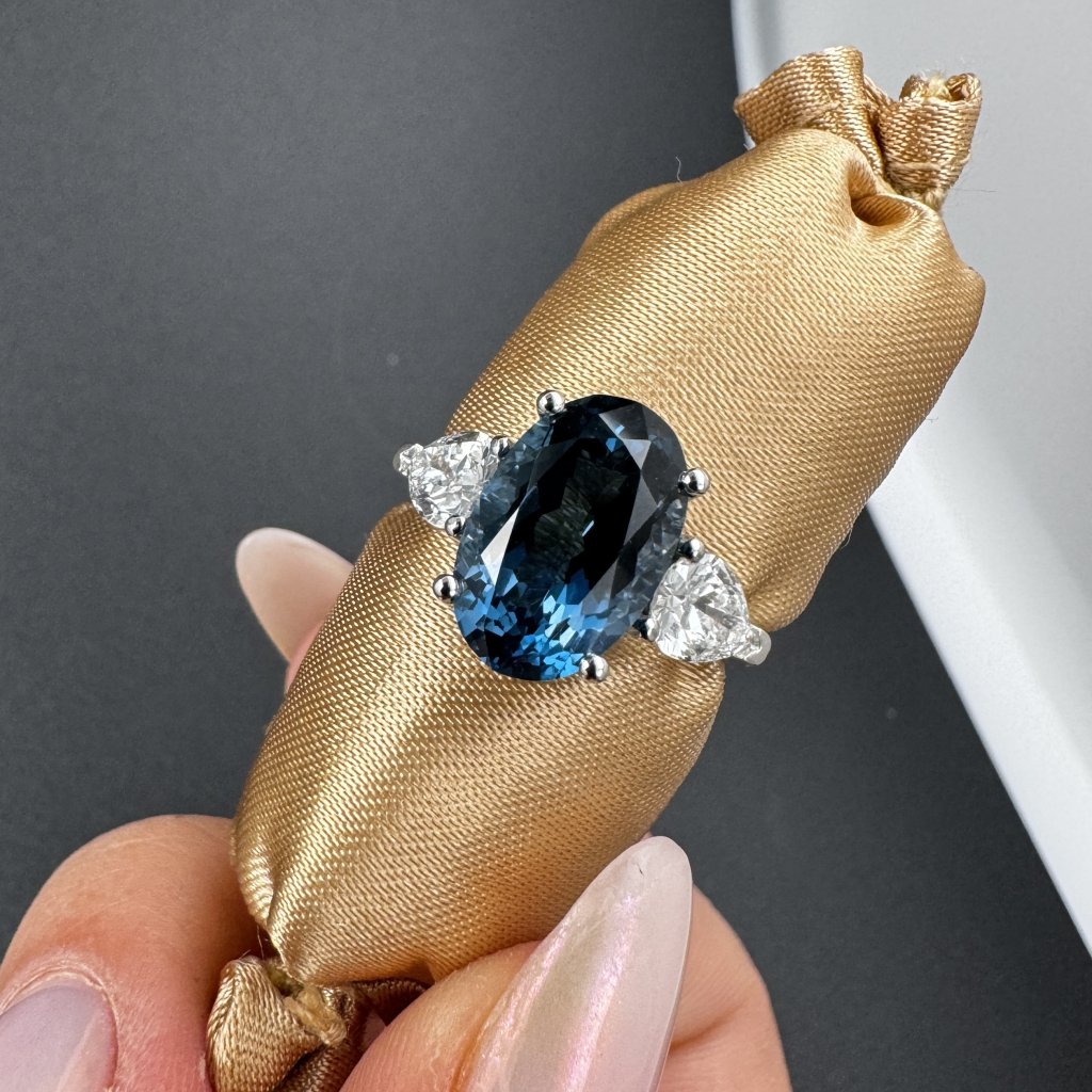 Tento elegantní prsten je vyroben z bílého zlata 14 karátů, což mu dodává nadčasový a čistý vzhled. Dominantou je výrazný modrý topaz oválného tvaru, který zaujme svou hloubkou barvy a brilancí. Po stranách hlavního kamene jsou zasazeny dva laboratorní diamanty, každý o hmotnosti 0,5 ct, tedy dohromady 1 ct.