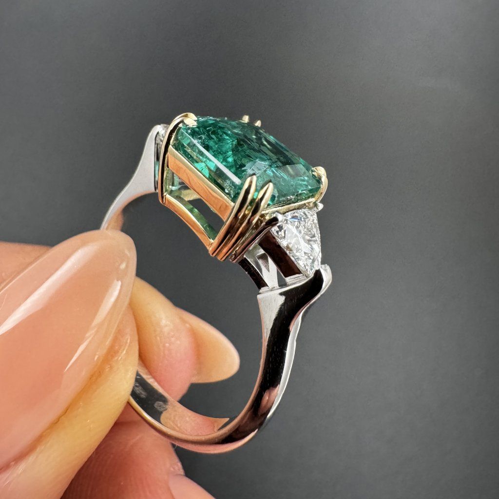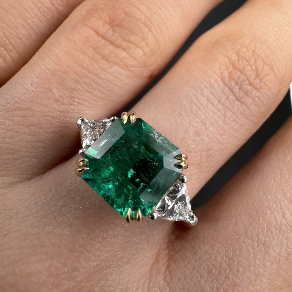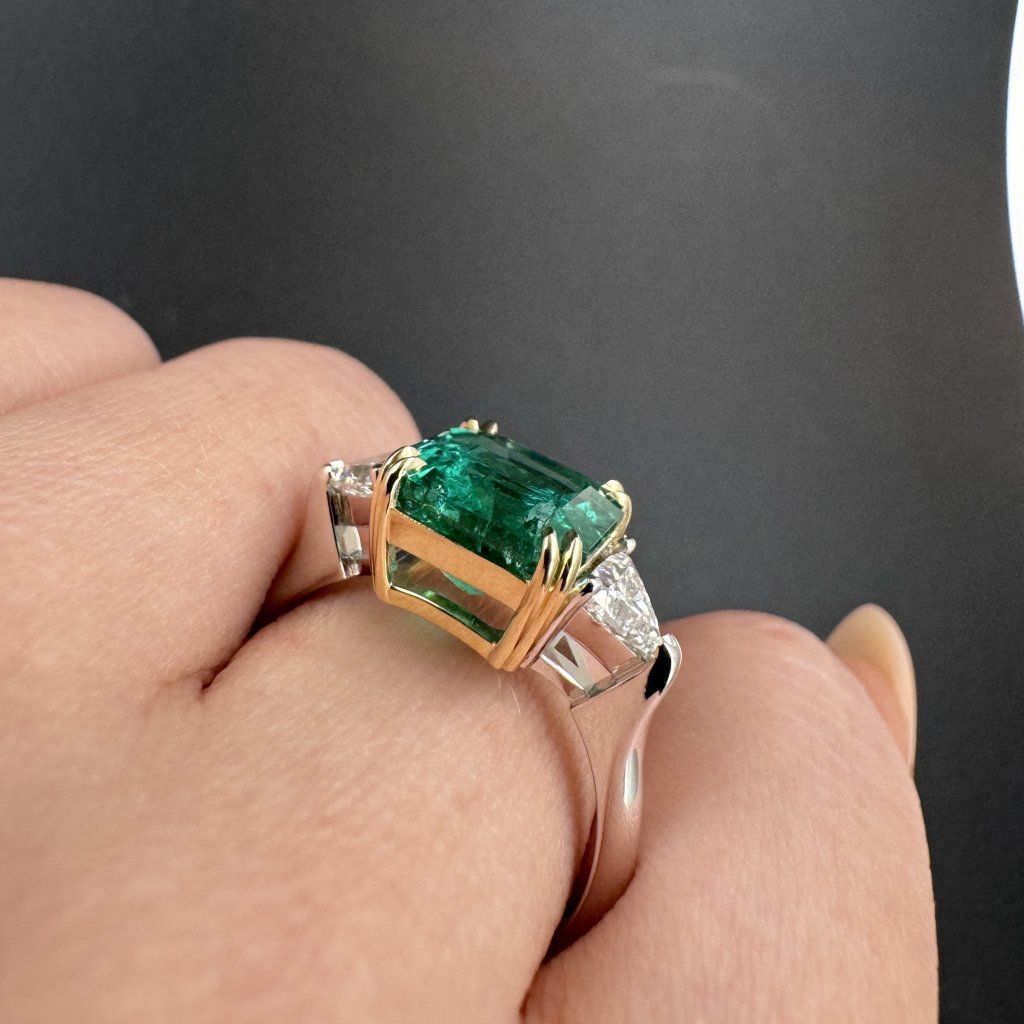 Elegantní a nadčasový prsten se smaragdem, doplněný po stranách dvěma laboratorně pěstovanými diamanty o hmotnosti 0,5 karátu každý. Harmonická kombinace 14 karátového bílého a žlutého zlata podtrhuje jeho luxusní charakter a vytváří působivý kontrast, který nechává vyniknout kráse centrálního kamene.