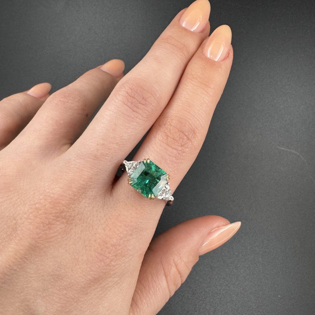 Smaragd pochází ze Zambie a vyznačuje se výjimečnou, etalonovou barvou Viding Green – hlubokým, sytým odstínem zelené, jenž symbolizuje eleganci a vzácnost. Jeho precizní rozměry 9,08 × 8,88 × 6,01 mm dodávají prstenu výraznost a jedinečný šarm.