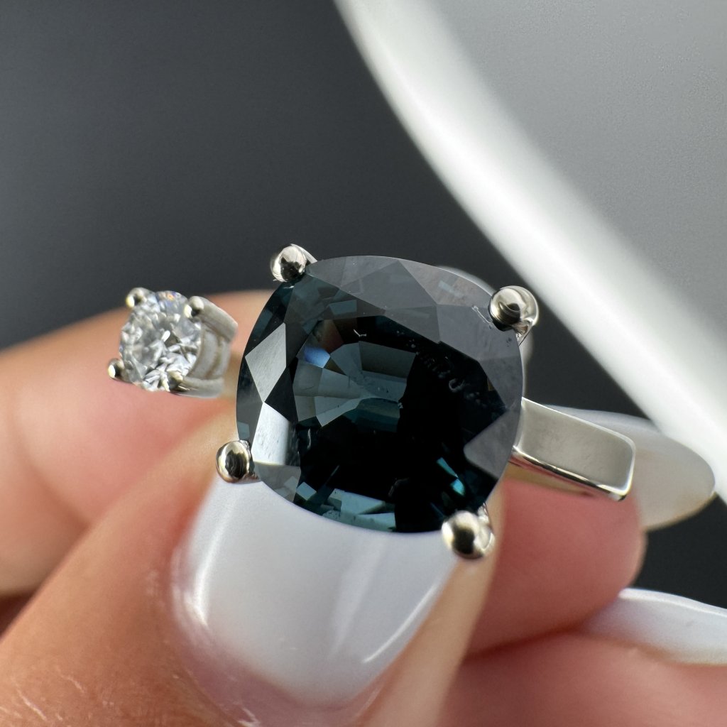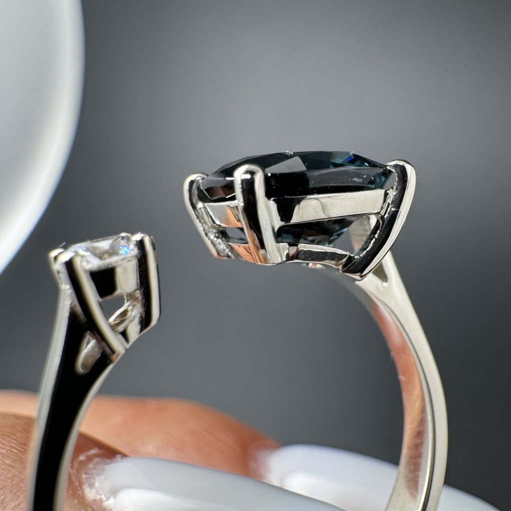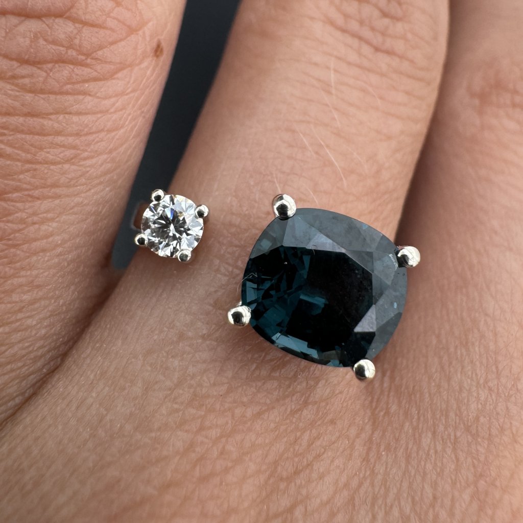 Elegantní otevřený prsten s temně modrozelenou spinelí a přírodním diamantem — pro ženy, které milují kontrasty, sílu a vzácnost.