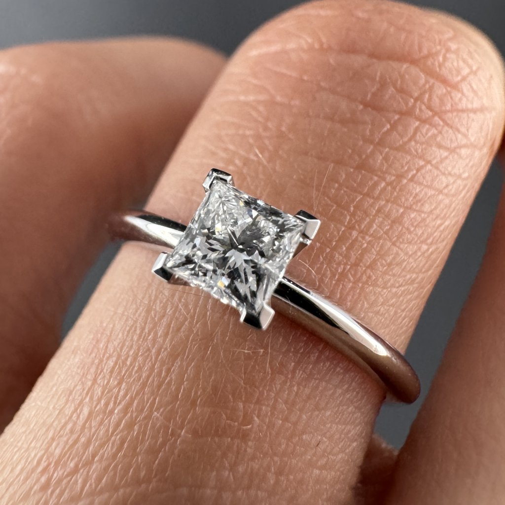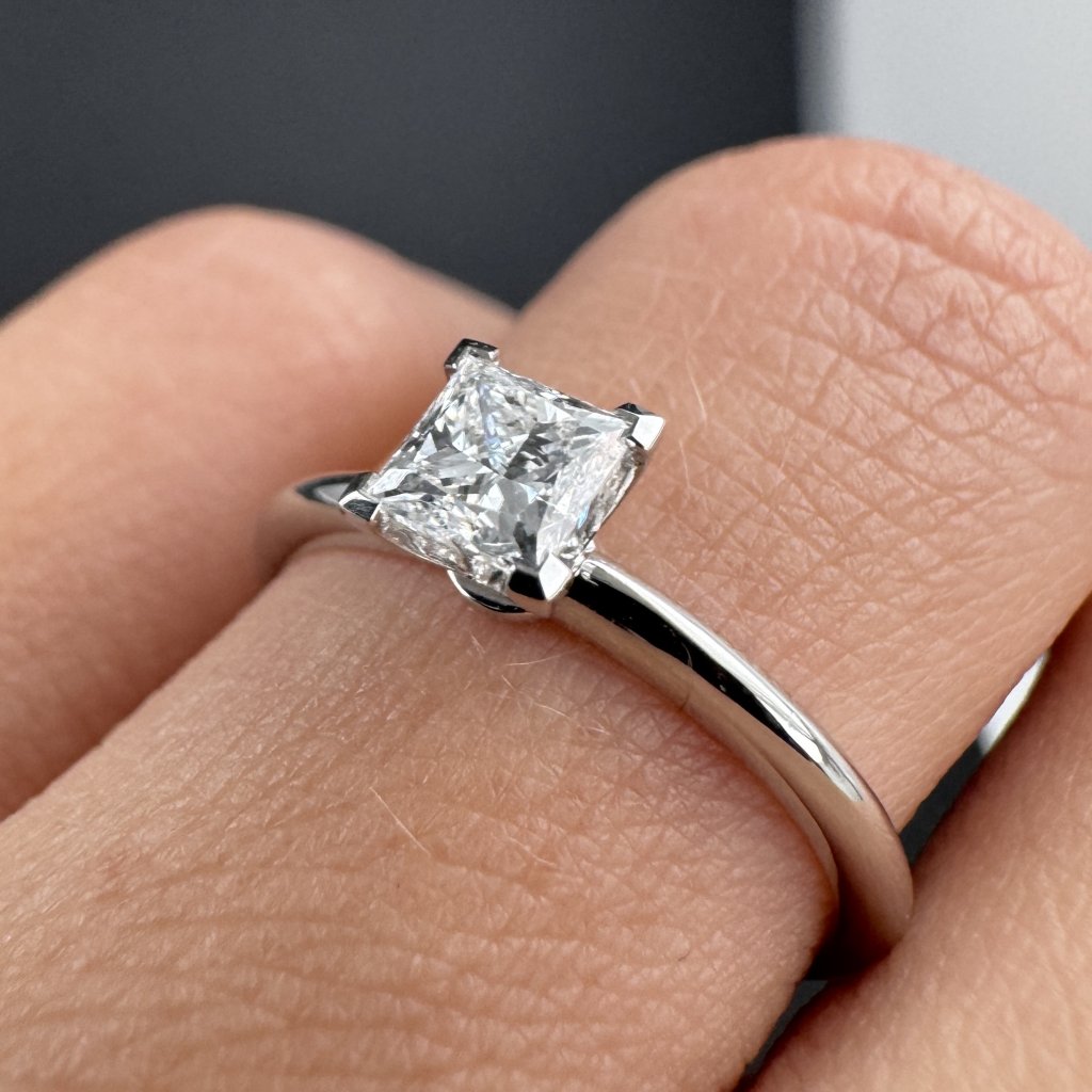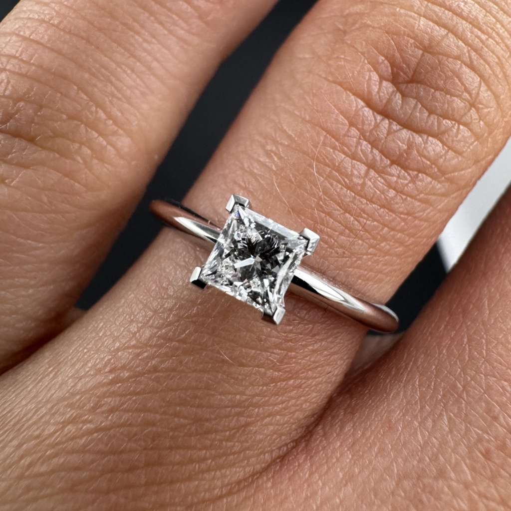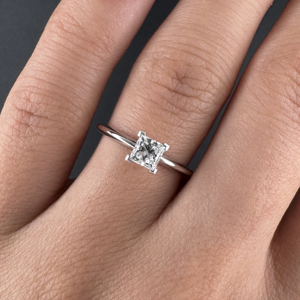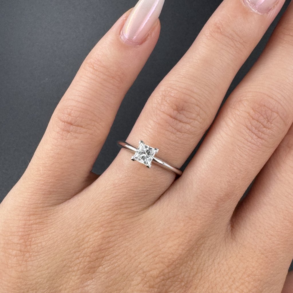 Elegantní zásnubní prsten z platiny s centrálním laboratorním diamantem brusu princezna o váze 0,40 ct. Minimalistický, ale oslnivý design pro výjimečný okamžik.