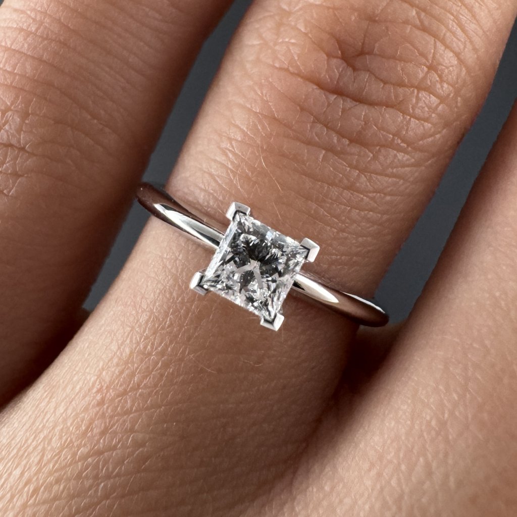 V jeho středu září laboratorní diamant o váze 0,40 ct, vybroušený do brusu princezna, který je ceněný pro svůj moderní čtvercový tvar a úžasnou brilanci. Ostré linie brusu princezna dokonale odrážejí světlo, čímž dodávají kameni výrazný třpyt a živost.