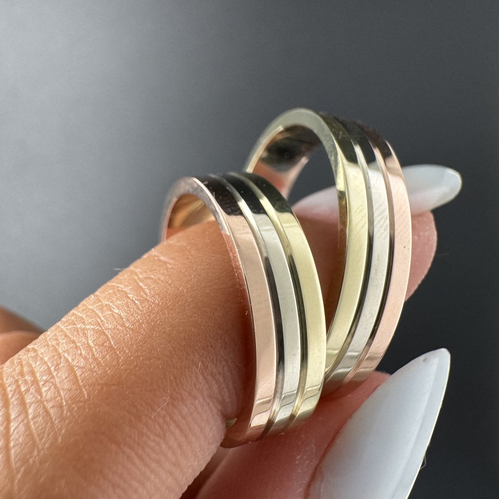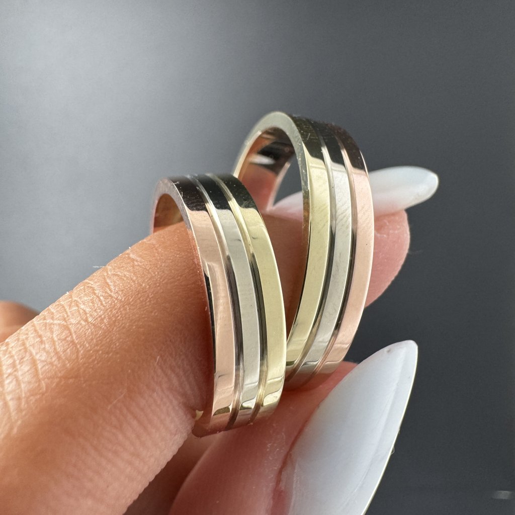 Snubní prsteny spojují tři odstíny zlata v elegantním a moderním designu. Ideální volba pro páry, které chtějí vyjádřit jednotu a harmonii ve svém vztahu.