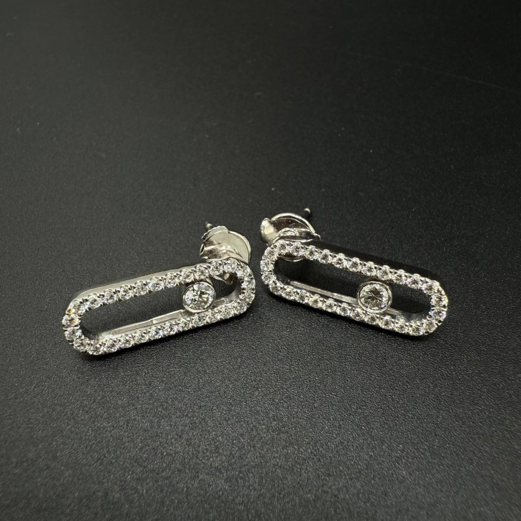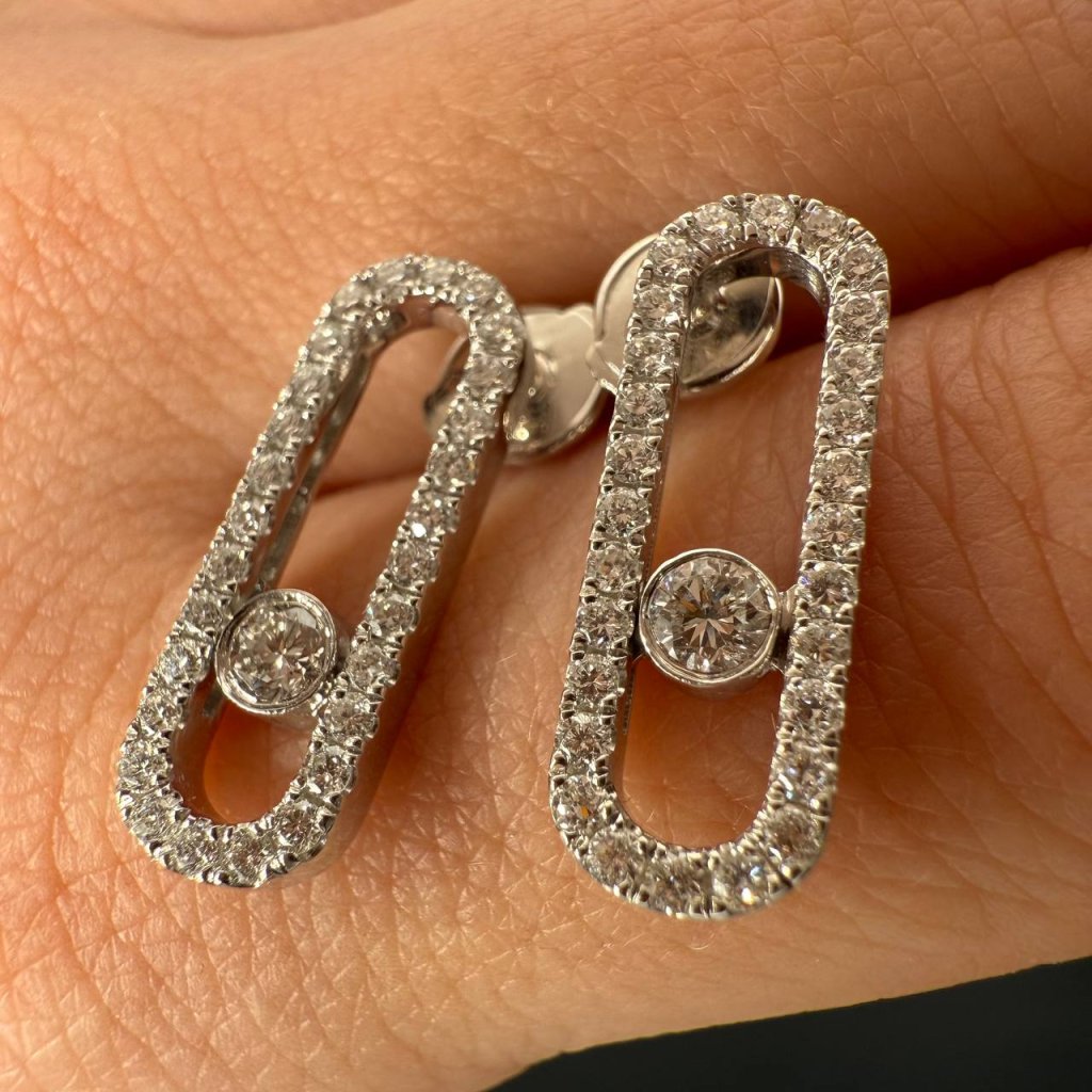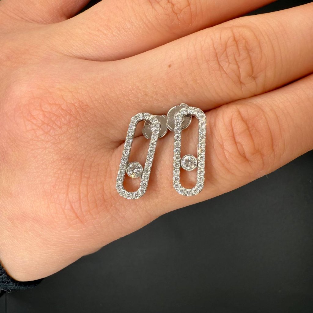 Tyto sofistikované náušnice z bilého zlata představují harmonické spojení moderního designu, jemného luxusu a precizního zlatnického zpracování. Prodloužený oválný tvar, bohatě osazený drobnými laboratorními diamanty v pavé stylu, vytváří elegantní siluetu, která působí lehce, vzdušně a současně výrazně. Uvnitř každé náušnice je zasazen samostatný diamant, který se při pohybu jemně posouvá a zachycuje světlo z různých úhlů – detail, který dodává šperku život a dynamiku.
